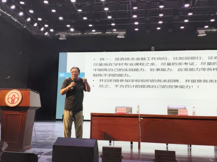 金融与投资学院院长项后军教授则将“专业学习引导” 与 “职场提前感知”相结合,针对专业基础强化、学习方法转型、职业规划与学术规范进行了详细的讲解和分析,帮助新生解决“专业方向不清晰”“职业规划无头绪” 等入学初期常见问题,为新生们开启大学学习与职业探索的双重引导。他强调,在数字化时代,同学们不仅要学好传统金融理论,更要主动拥抱金融科技,具备跨学科视野和终身学习的能力,在未来的学习生涯中不断探索,为未来的职业发展和社会贡献奠定坚实基础。