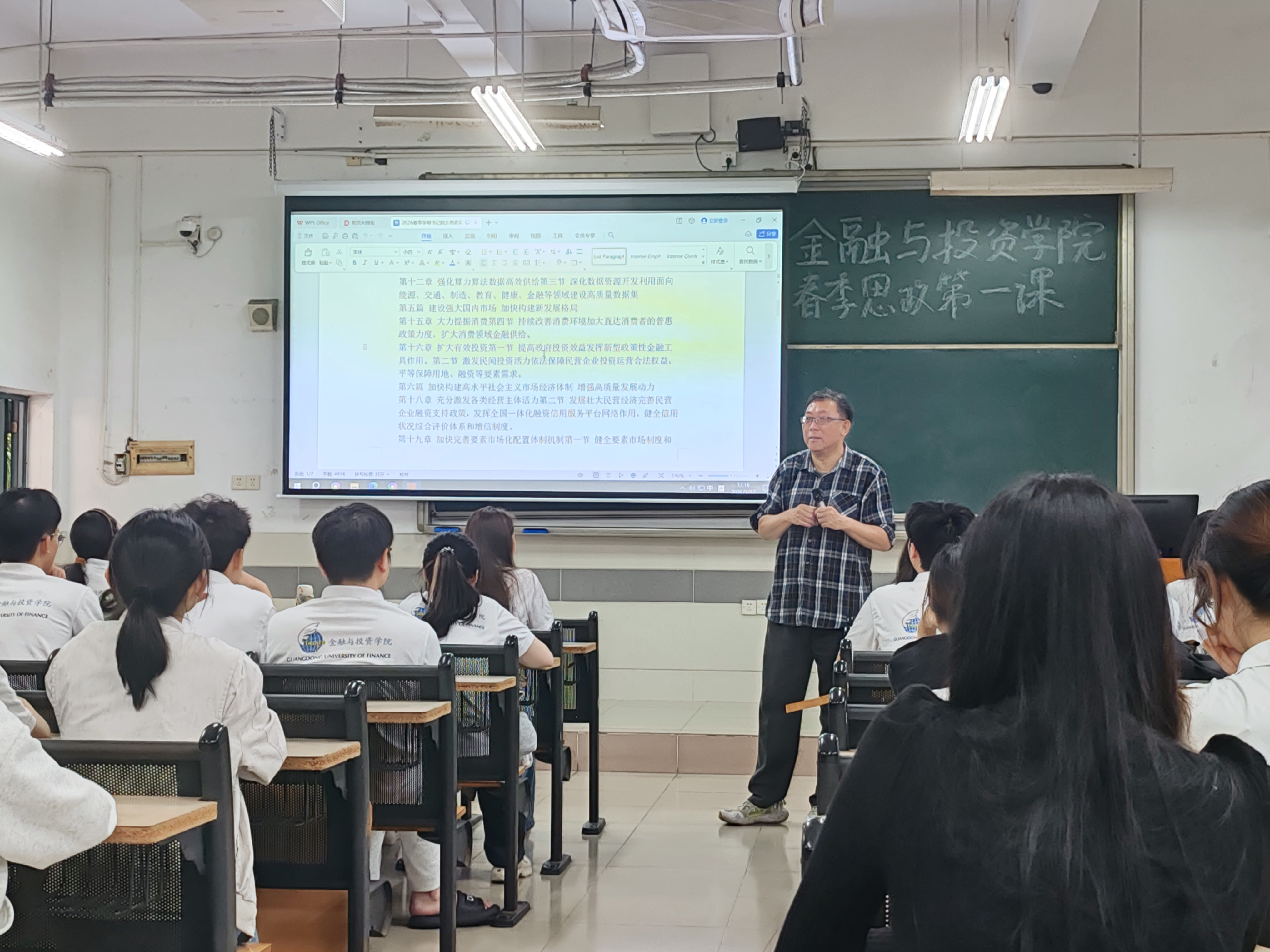 金融与投资学院副书记黄镜秋紧扣树立和践行正确政绩观学习教育,讲授《以正确政绩观深刻理解五年规划彰显的制度优势全力奋进“十五五”规划新征程》为主题的“思政第一课”。他结合党的二十大以来国家发展取得的历史性成就,从“五年规划的历史脉络与战略意义”、“正确政绩观的核心内涵与时代要求”、“青年学子在‘十五五’规划中的使命担当”三个维度展开讲解。他以“十四五”时期我国经济总量突破百万亿、脱贫攻坚战全面胜利等鲜活案例,生动阐释了五年规划作为国家治理体系的重要组成部分,如何集中力量办大事、推动高质量发展的制度优势。同时,他强调正确政绩观是“为民造福”的价值导向,是“功成不必在我、功成必定有我”的境界担当,鼓励同学们将个人发展融入国家战略,在专业学习中锤炼过硬本领,在社会实践中增长智慧才干,以实际行动树立和践行正确政绩观,为国家实施“十五五”规划贡献青春力量。