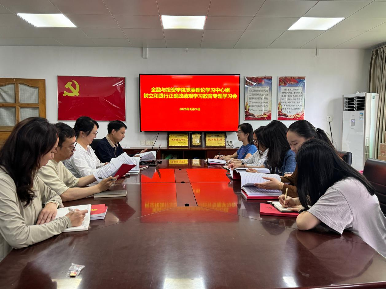 3月24日,金融与投资学院党委理论学习中心组举行树立和践行正确政绩观学习教育专题学习会,深入学习贯彻习近平总书记在全国两会期间的重要讲话精神和全国两会精神,认真学习领会习近平总书记关于树立和践行正确政绩观的重要论述。学院党委副书记黄镜秋主持会议并领学,金融与投资学院党委理论学习中心组成员参加学习。