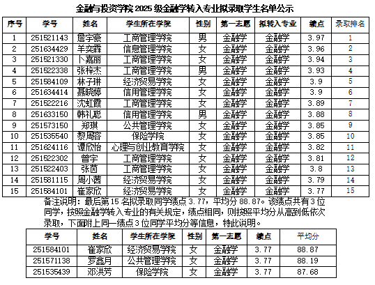 根据《广东金融学院学生管理规定》和《广东金融学院全日制本科学生转专业管理办法(2026年修订)》的有关要求,我院按照教务处公布的《金融与投资学院2025级金融学转入专业实施方案》,于2026年4月20日对申请金融学转入专业的学生进行审核,按照第一志愿申请者的第一学期学分绩点从高到低(绩点相同,则按平均分从高到低依次排序录取)拟录取前15名学生,现将拟录取名单公示如下,如有异议,请于2026年4月24日16:00前向金融与投资学院院办吴老师反映。电话:020-37216196 。